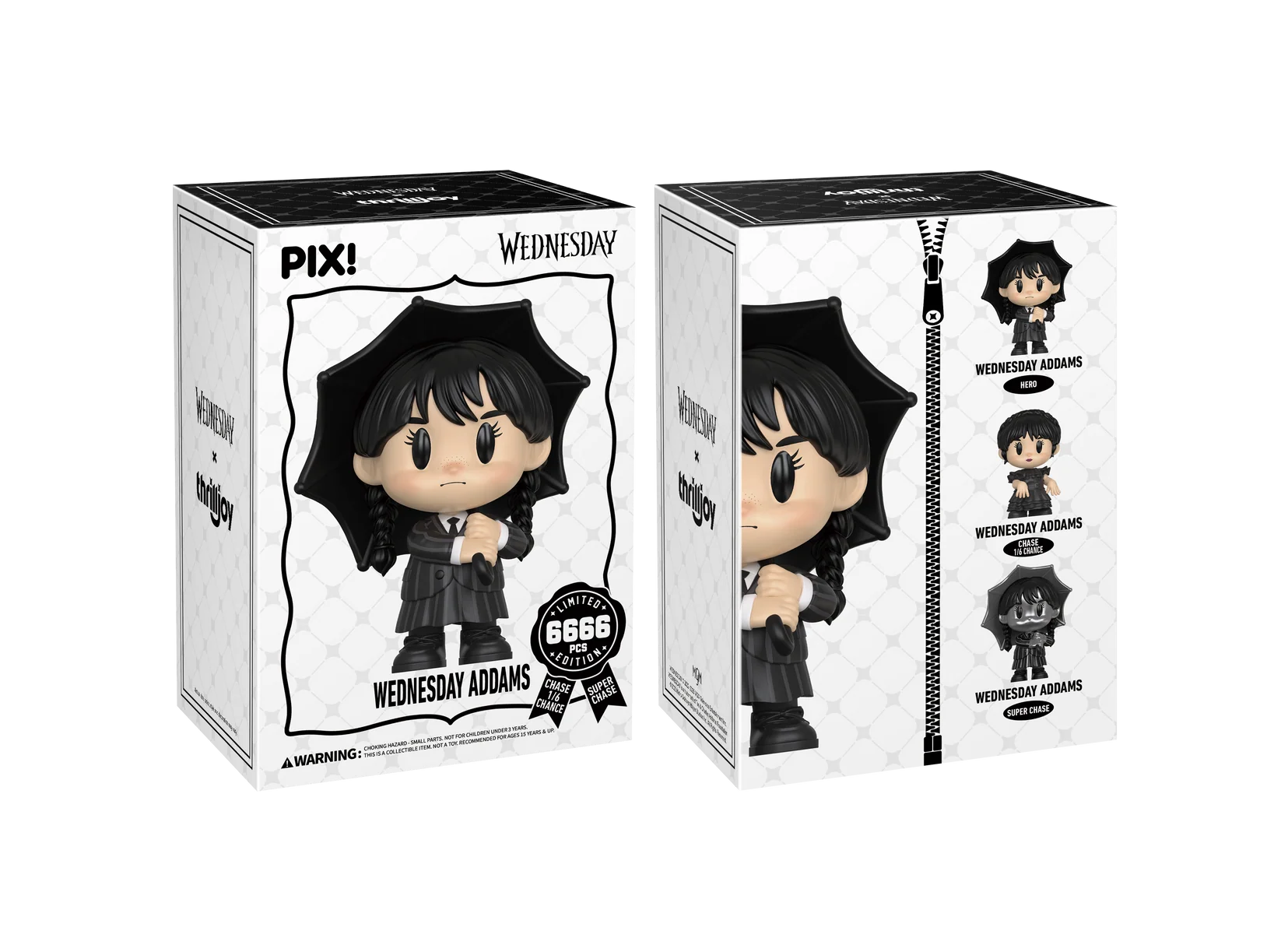 Be afraid. Be very afraid. Featuring Wednesday in her all-black school uniform, long braids, holding her iconic black umbrella, complete with the look of dread on her face. In Wednesday latest vision, she saw herself sitting right on your shelves. This PIX! is perfect for fans who love supernatural mysteries!This limited-edition PIX! comes with a super-rare 96-piece chase featuring an all-black metallic variant of Wednesday!All Wednesday PIX! comes with a Certificate of Authenticity in the form of a laser printed, spot varnished collector’s card, and are ready to hang on your wall or stack with the rest of your collection. Each collectible has a 1-of-6 odds of a chase!Don’t wait— grab Wednesday before she starts causing trouble!
